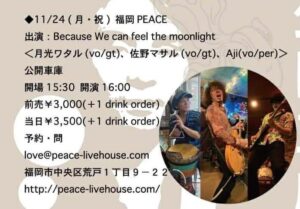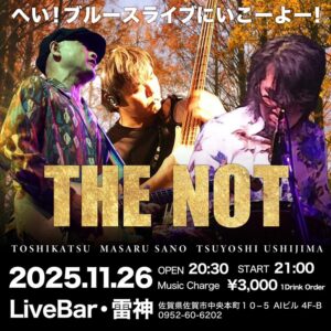 11月後半~12月のライブ情報! 11~12月もライブやっていきます! 11.24(Mon)Because We can feel the moonlight@福岡PEACE 11.26(Tue)THE NOT@Live bar 雷神 12.23(Tue)THE NOT & 今給黎博美 LIVE@KID ROCK(福岡市舞鶴)