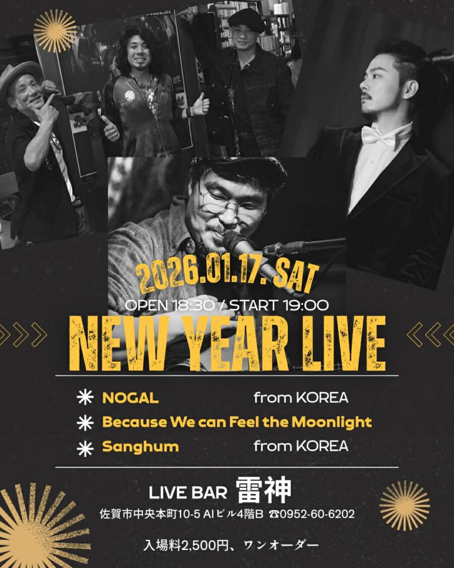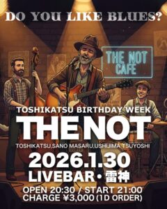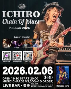 2026/1~2月のライブ情報!! 1~2月もライブやっていきます! 1.17(Sat) NEW YEAR LIVE!!@Live bar 雷神 1.30(Fri) THE NOT LIVE!!(TOSHIKATSU BIRTHDAY WEEK)@Live bar雷神 2.6(Fri) ICHIRO LIVE!! – Chain Of Blues in SAGA 2026 -@Live bar 雷神
